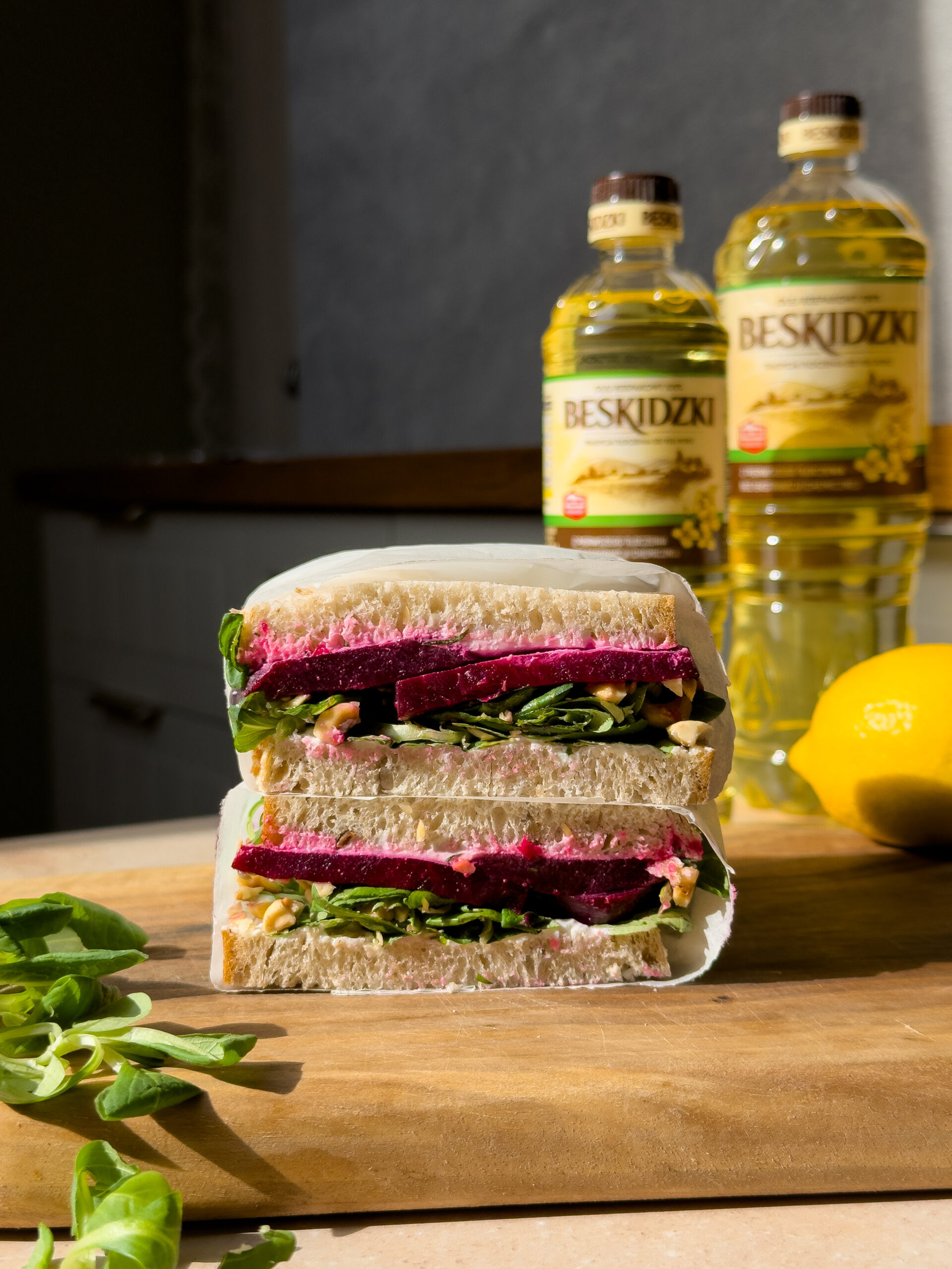 Kanapka z pieczonym burakiem, roszponką i kozim serem